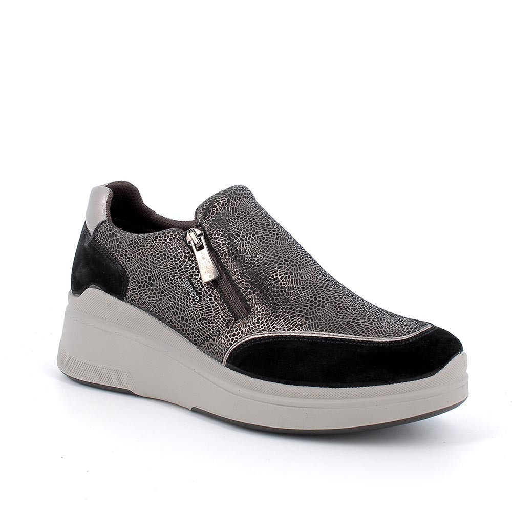 Slip on con leggera zeppa che assicura una comoda camminata. Queste calzature sono realizzate in morbida pelle scamosciata. Chiusura elastico più zip laterale per una facile calzata. Il sottopiede estraibile in pelle garantisce massima igiene.