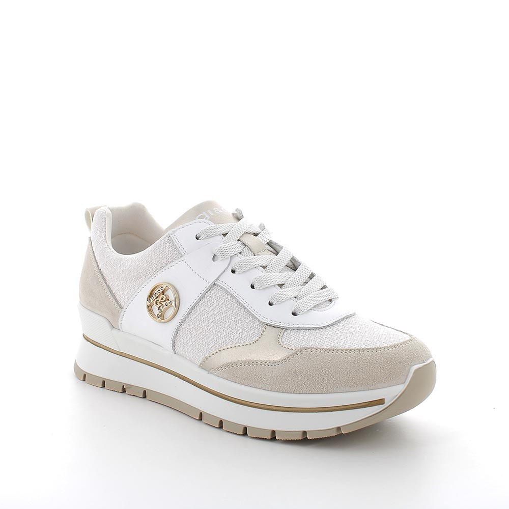 Sneakers per una donna che sceglie la sobrietà senza mancare di stile. Queste scarpe in pelle sono un prodotto trasversale che completa facilmente sia outfit formali che disinvolti. Dotate di una leggerissima suola a zeppa, regalano centimetri in più senza stancare il piede e possono essere indossate anche per molte ore. Il sottopiede anatomico è estraibile e rivestito in pelle per assicurare traspirabilità e igiene.