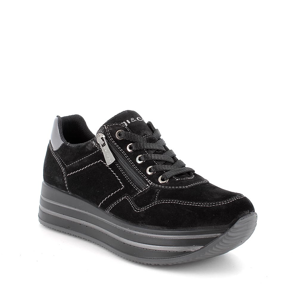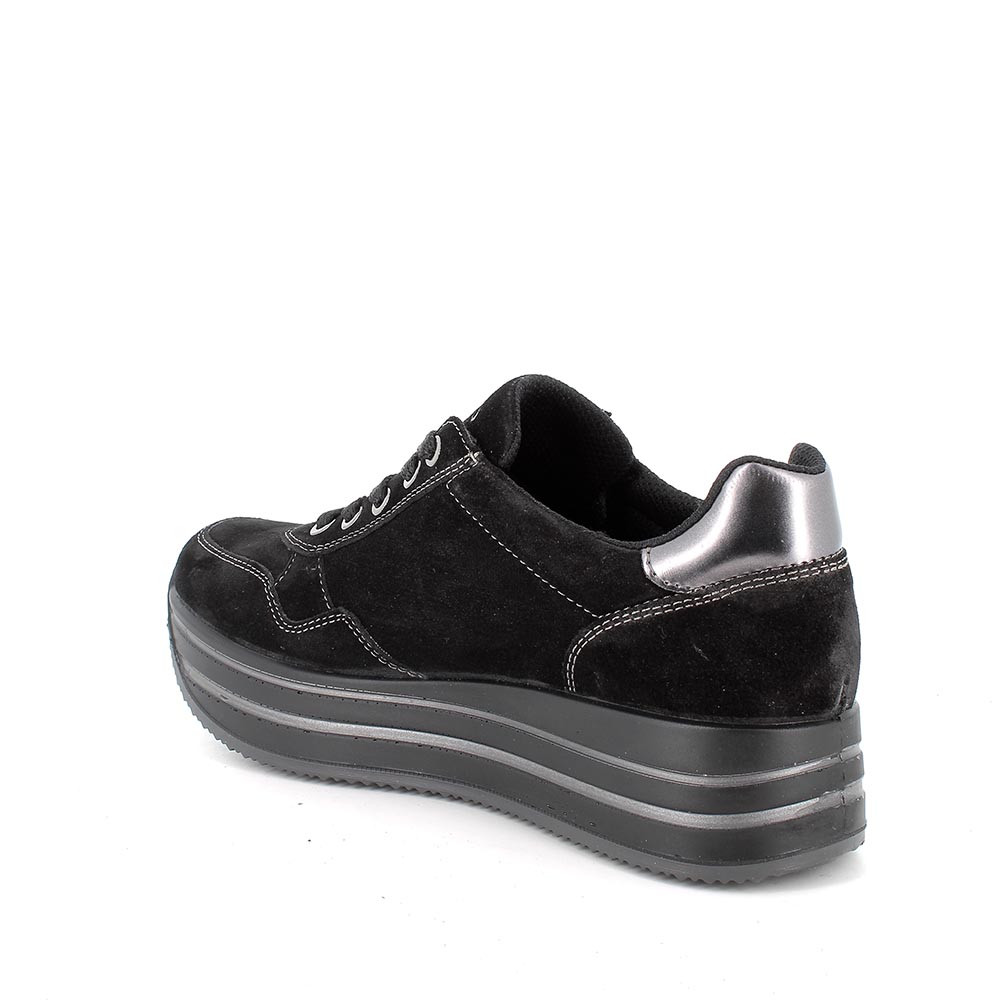 Sneakers per una donna che in inverno sceglie la sobrietà senza mancare di stile. Queste scarpe in pelle sono un prodotto trasversale che completa facilmente sia outfit formali che disinvolti. Dotate di una leggerissima suola a zeppa, regalano centimetri in più senza stancare il piede e possono essere indossate anche per molte ore. Il sottopiede anatomico è estraibile e rivestito in pelle per assicurare traspirabilità e igiene.
