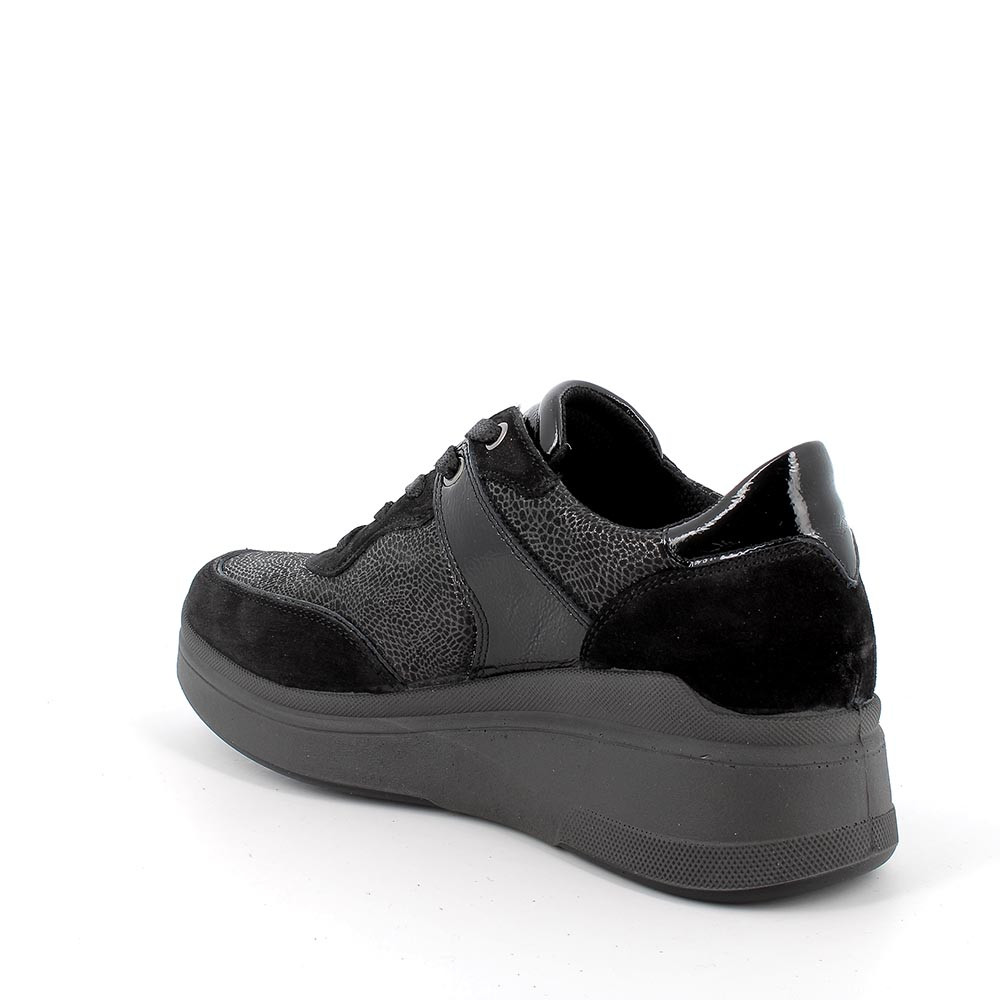 Sneakers con zeppa in pelle da donna nero laminato