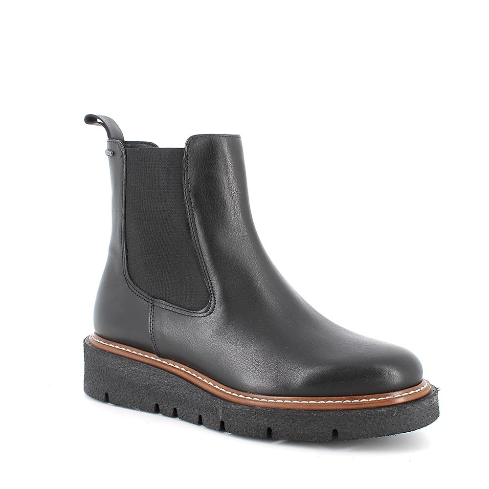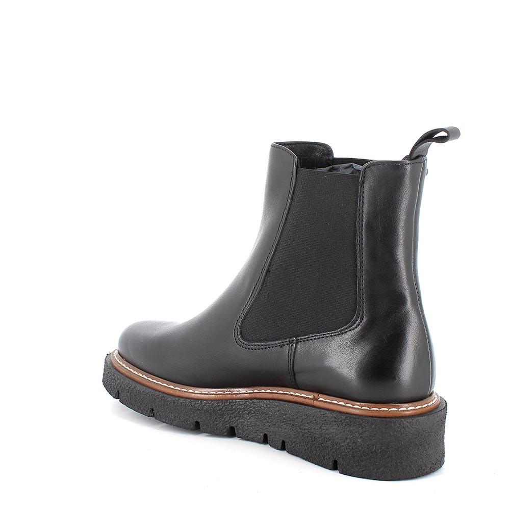 Uno stivaletto chelsea con zeppa è una alternativa più sobria ai chunky boots con tacco. Soddisfa le esigenze di una donna che vuole essere assolutamente trendy senza eccessi. Questo tronchetto in pelle ha una suola effetto gomma naturale, ma notevolmente più leggera, per il massimo comfort. Il sottopiede anatomico è estraibile e rivestito in pelle per assicurare traspirabilità e igiene.
