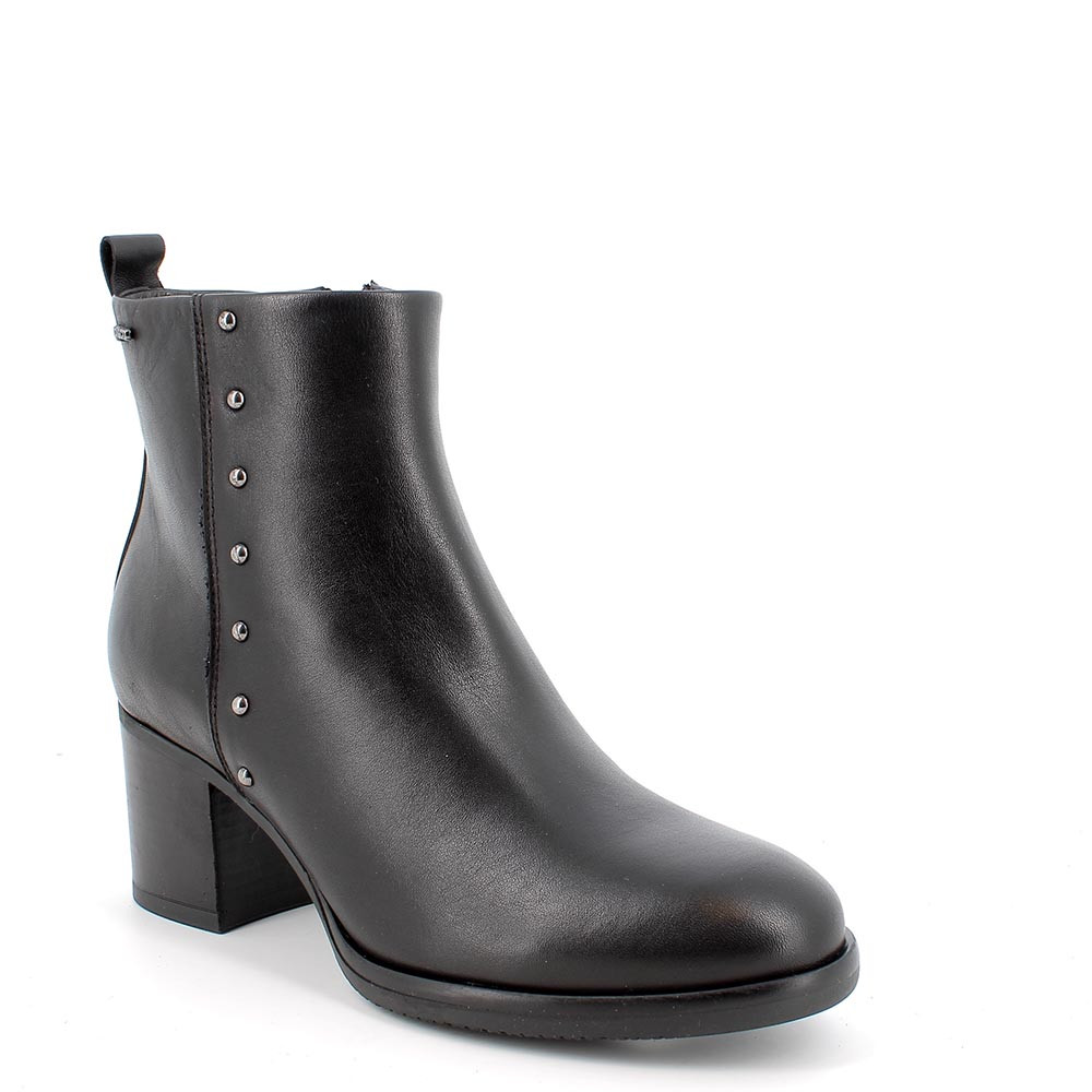 Stivaletti eleganti da donna caratterizzati da borchiette metalliche laterali che aggiungono personalità. La silhouette di questi tronchetti in pelle è sobria e femminile. La suola ha un tacco che garantisce comodità e slancia la figura. La fodera è in tessuto mentre il sottopiede è in pelle.