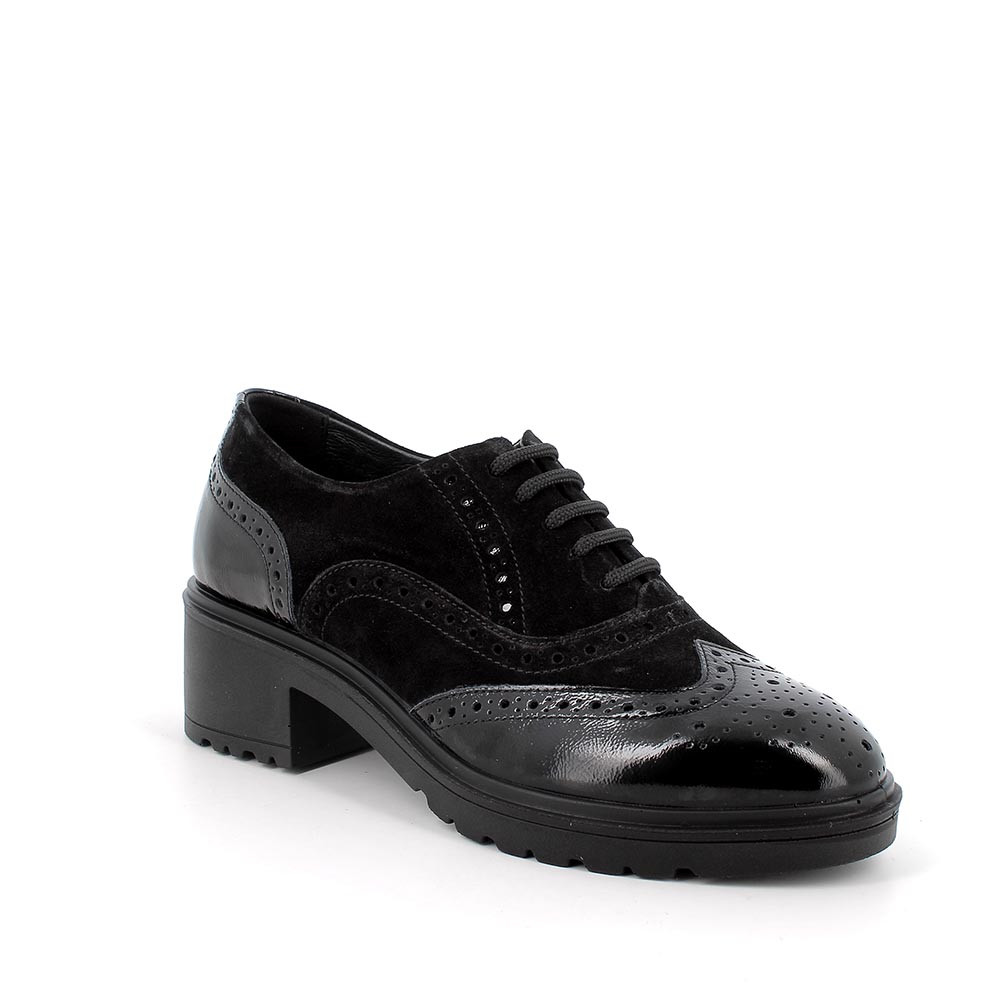 Francesina stringata con tacco, in pelle. La fodera in pelle e il sottopiede estraibile in pelle assicura massimo confort ed igiene.