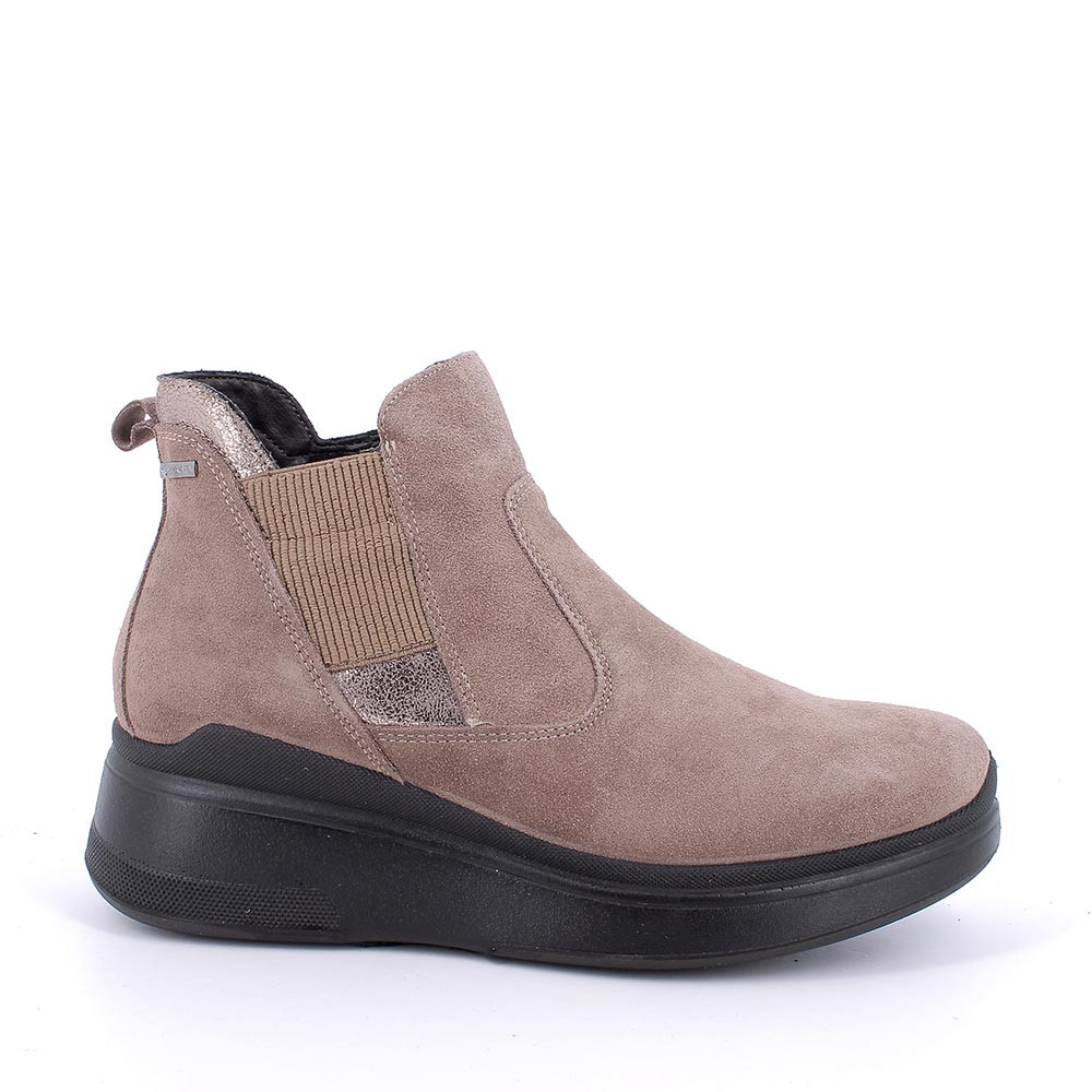 Ботильоны с верхом из замши с технологией GTX на легкой танкетке. Надевание облегчено резинкой с боковой молнией. Водонепроницаемая мембрана GTX. Съемная кожаная стелька для максимального комфорта и поддержания гигиены.