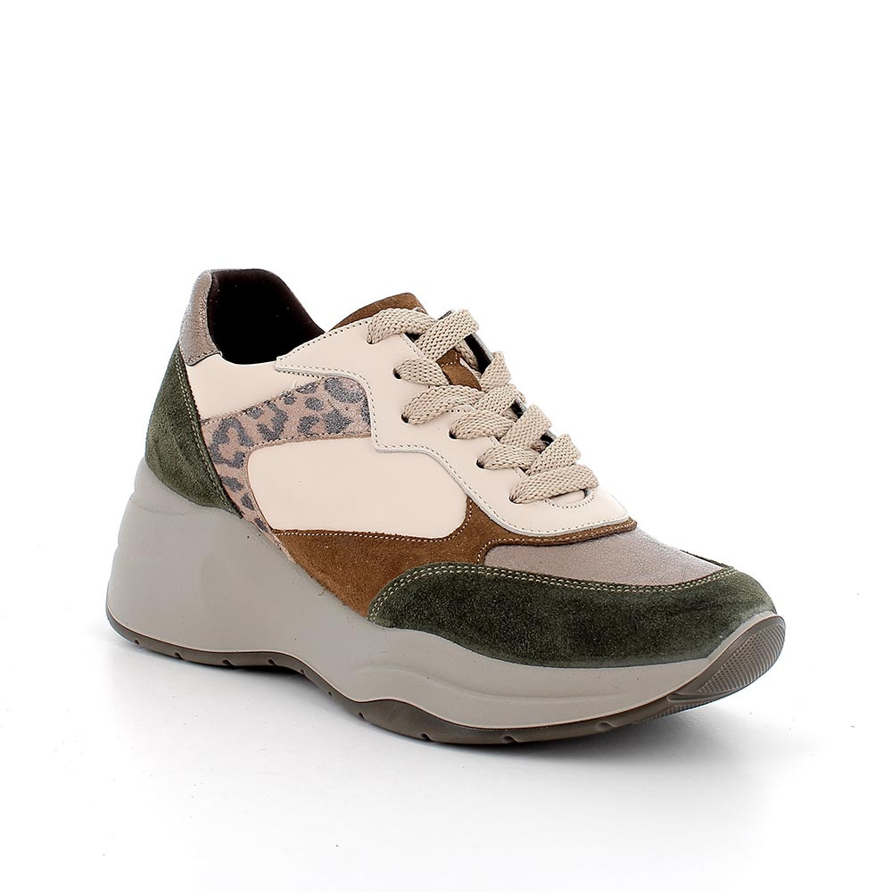 Кроссовки на шнуровке с высокой танкеткой. Верх сделан из гармонично сочетаемых материалов, что делает эту модель очень стильной. Кроссовки оснащены съемной кожаной стелькой для поддержания гигиены стопы.
