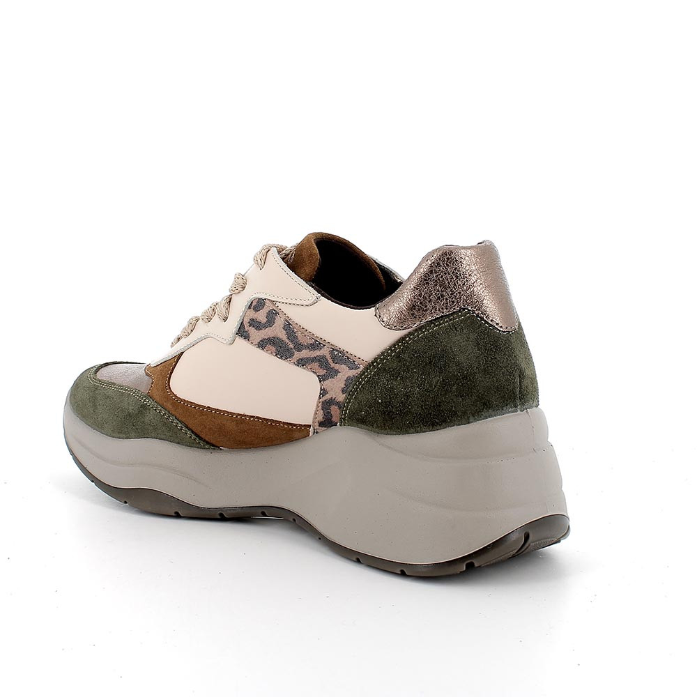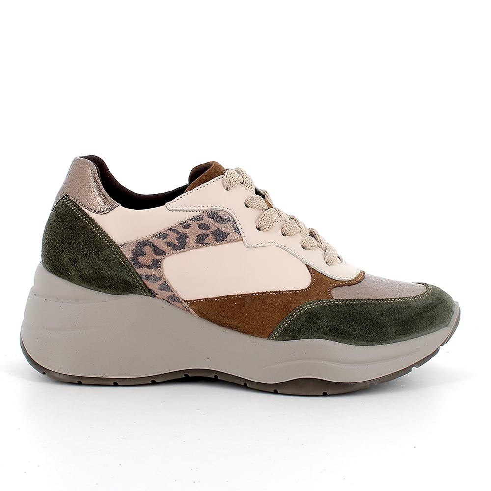 ЖЕНСКИЕ КОЖАНЫЕ КРОССОВКИ НА ТАНКЕТКЕ ЗЕЛЕНЫЙ, БЕЖЕВЫЙ