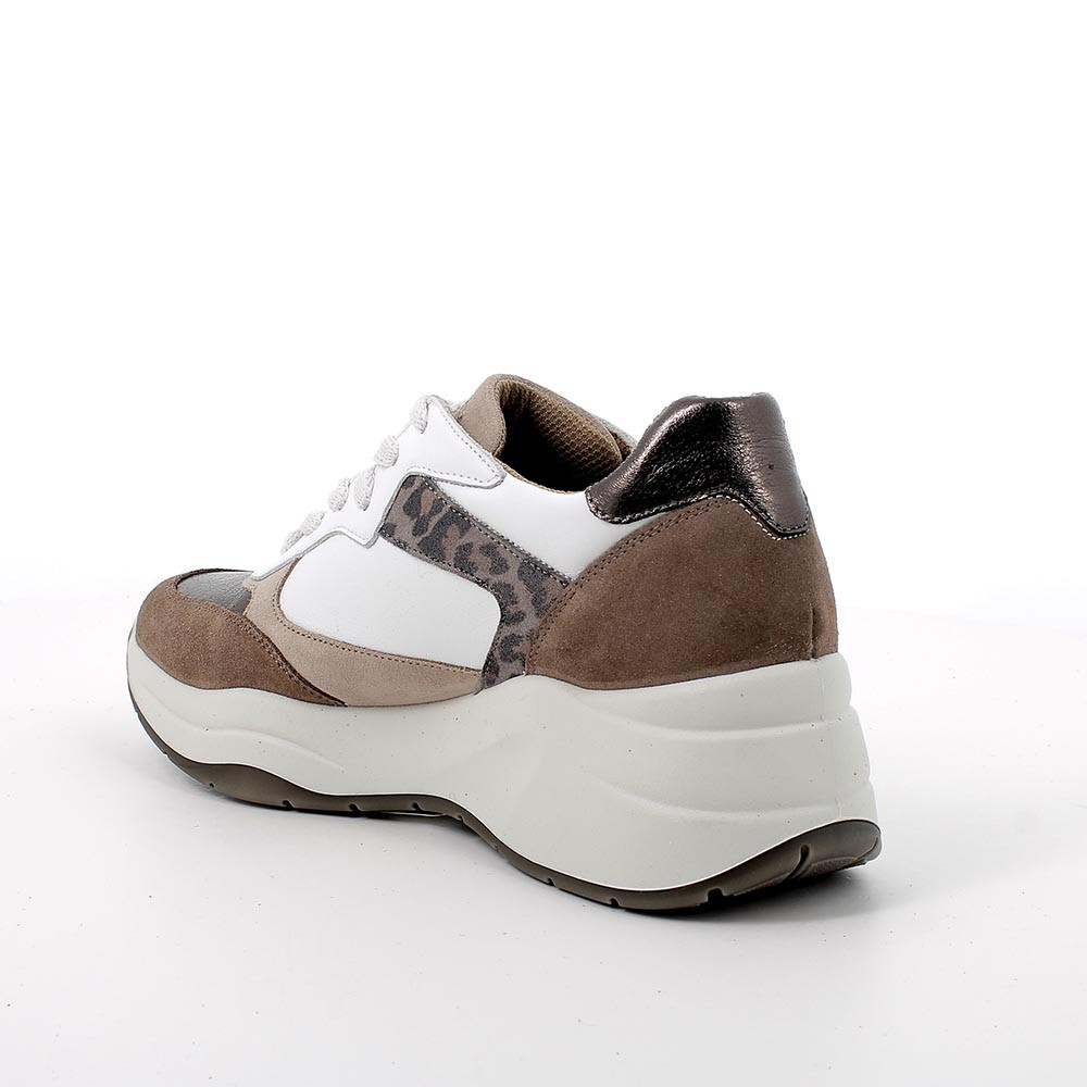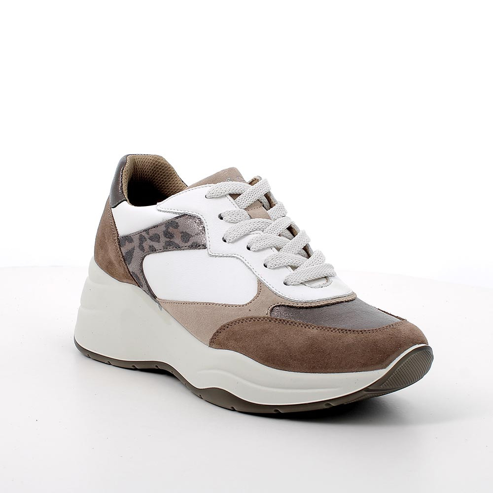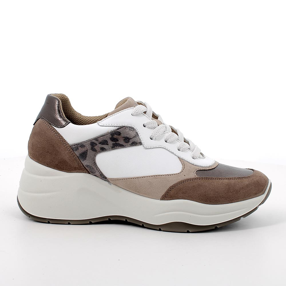 Кроссовки на шнуровке с высокой танкеткой. Верх сделан из гармонично сочетаемых материалов, что делает эту модель очень стильной. Кроссовки оснащены съемной кожаной стелькой для поддержания гигиены стопы.